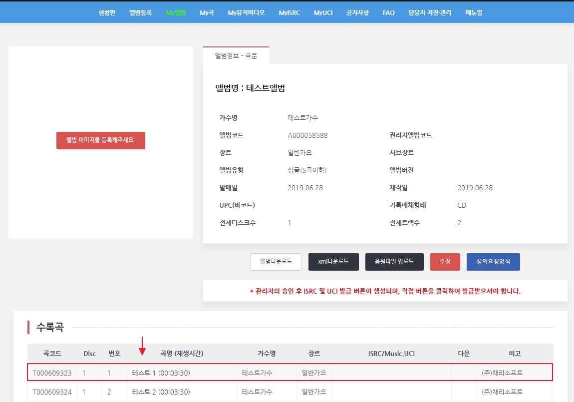 1. 앨범 및 곡정보 직접 수정은 ISRC, UCI 발급 전 상태에서만 가능합니다